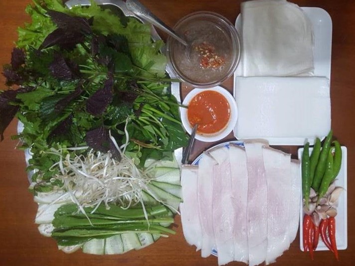 Với món ăn này, rau là một thực phẩm không thể thiếu được. Bánh tráng cuốn thịt heo Đà Nẵng tận dụng những loại rau vườn, phổ biến mang hương vị tươi mát. Rau ăn kèm không cầu kỳ, khó kiếm nhưng cái khó là chọn được rau tươi và non để khi ăn kèm với thịt heo vẫn giữ nguyên được hương vị. Với từng cuốn bánh, thực khách có thể cảm nhận được sự tươi mát của xà lách, vị thơm nồng của rau quế, rau thơm, diếp cá, vị chát nhẹ của chuối trái xắt lát mỏng cùng với vị là lạ của tía tô…Nước chấm dành cho món ăn này chính là mắm nêm, vị mắm nêm kết hợp với thịt heo trong bánh tráng tạo sự hài hòa và thơm nồng. Các bạn yên tâm khi ăn món này là đảm bảo no mà giả cả lại hợp lý với túi tiền của chúng ta.Giá cả : 55K/ phần .Ngoài ra thì nhà hàng còn có nhiều món khác với thực đơn có sẵn (xem ảnh).